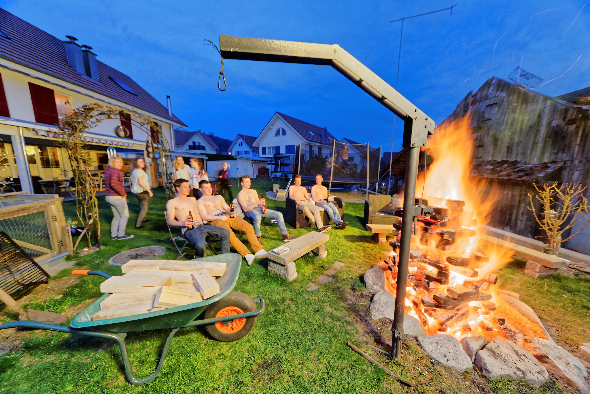 Familie Walter und Bernadette (Beni) Schnarwiler-Burri mit ihren 5 Toechtern und Besuchern (Laura, Celine, Martina, Ramona, Simona, Gabriela, Timon, Patrick, Jonas und Manuel) am Samstagabendfeuer vor ihrem Eigenheim an der Moosbergstrasse 6 in Gelfingen/L