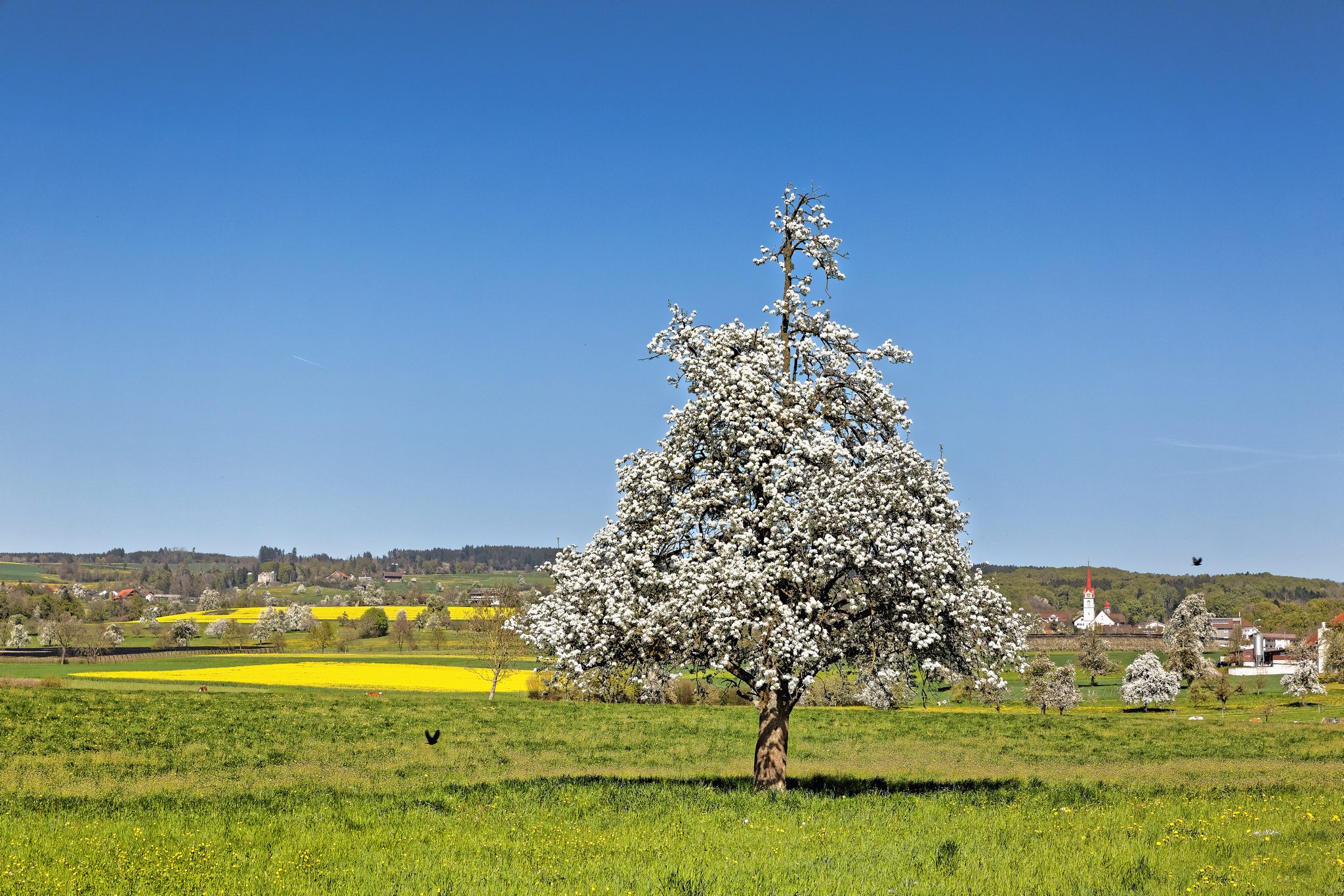 Blick auf Kleinwangen mitten in der Fruehlingsbluete. Foto zu Projekt Sehtal (Luzerner Seetal).