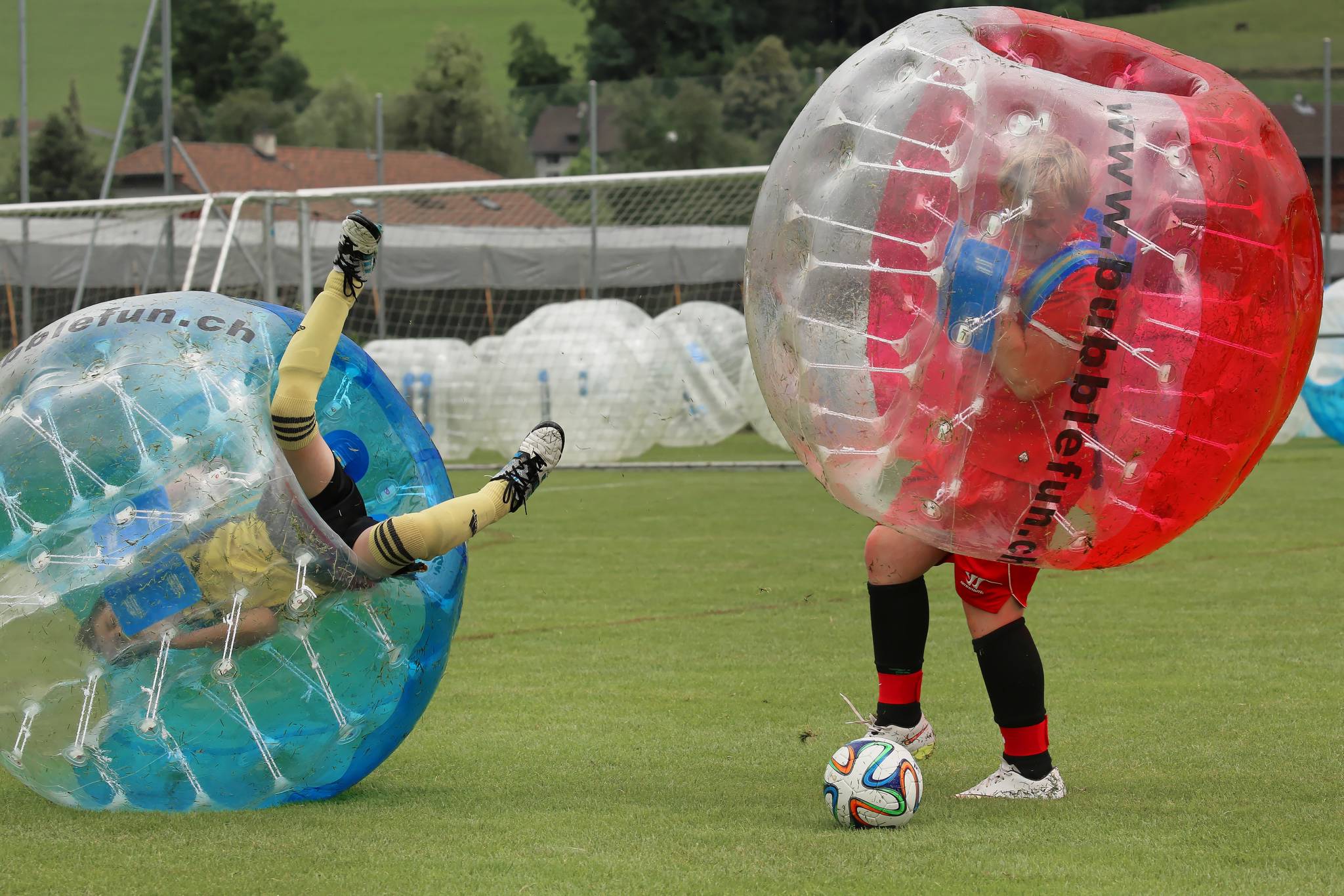 Sichtbare Aufprallenergie: Zweikampf JuniorInnen am 2. Bubble Fussball Turnier des FC Hitzkirch auf dem Sportplatz Hegler Hitzkirch.