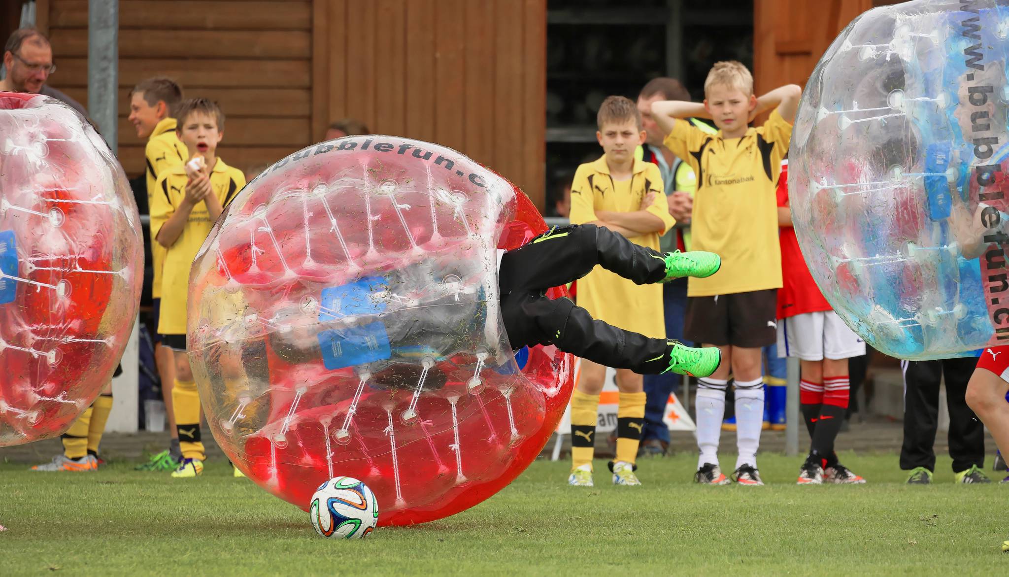 Sichtbare Aufprallenergie: Zweikampf JuniorInnen am 2. Bubble Fussball Turnier des FC Hitzkirch auf dem Sportplatz Hegler Hitzkirch.