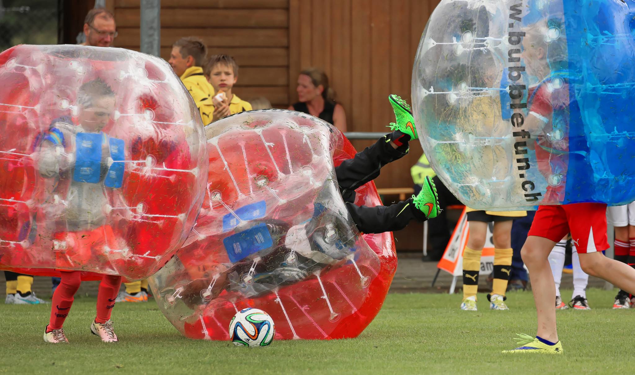 Sichtbare Aufprallenergie: Zweikampf JuniorInnen am 2. Bubble Fussball Turnier des FC Hitzkirch auf dem Sportplatz Hegler Hitzkirch.