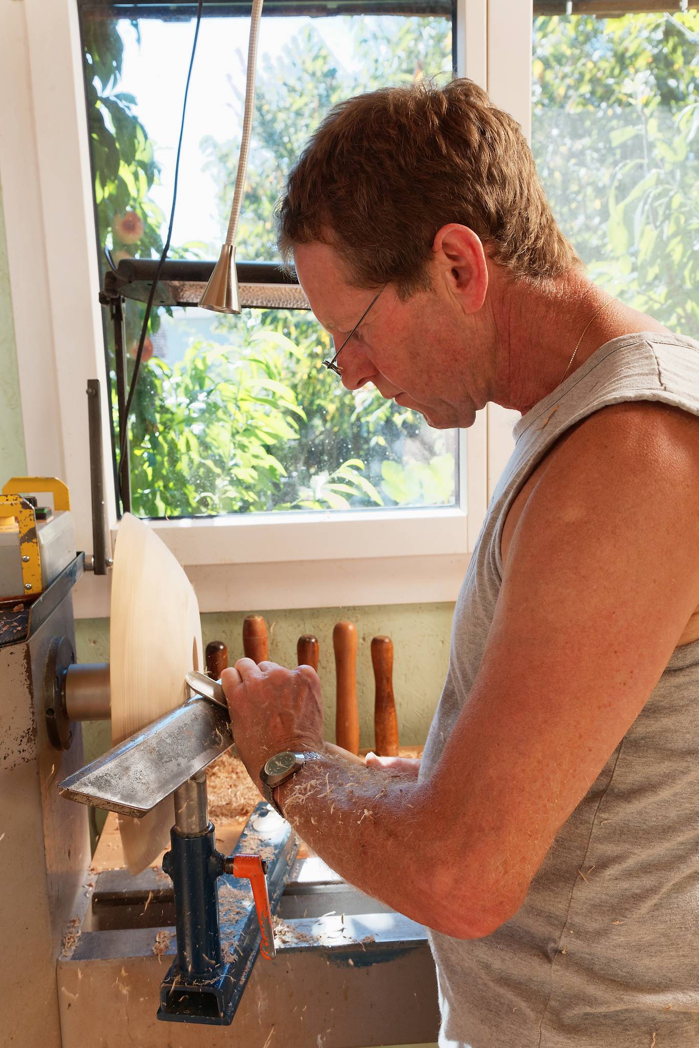 Vor Monaten hat Beat Häfiger eine Rohform gedrechselt und das Holzstück dann trocknen lassen. Nun entsteht aus dem Rohling eine filigrane Schale.
