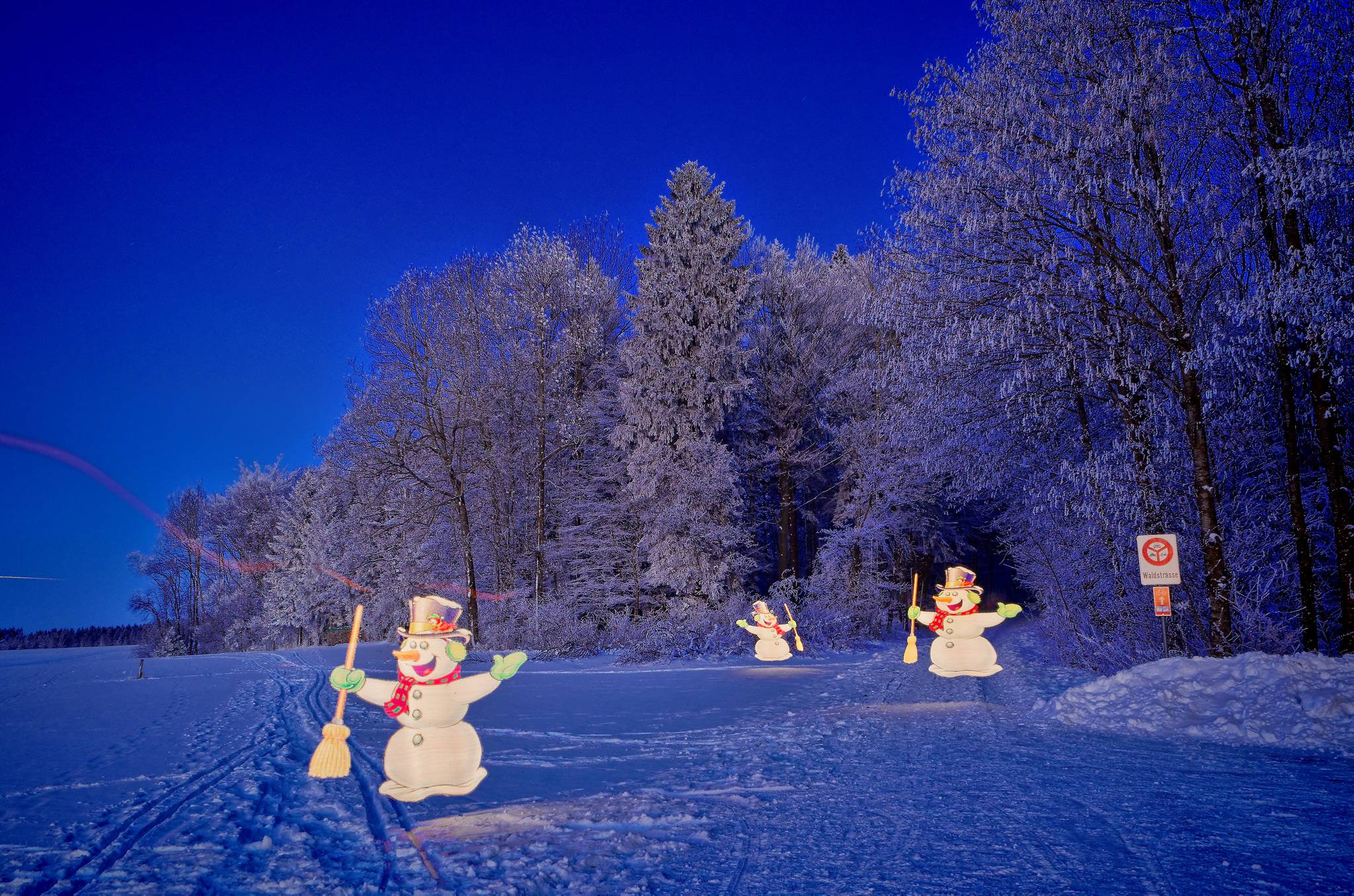Pixelstickereien am Waldrand: Nach Sonnenuntergang tanzen die Schneemänner…