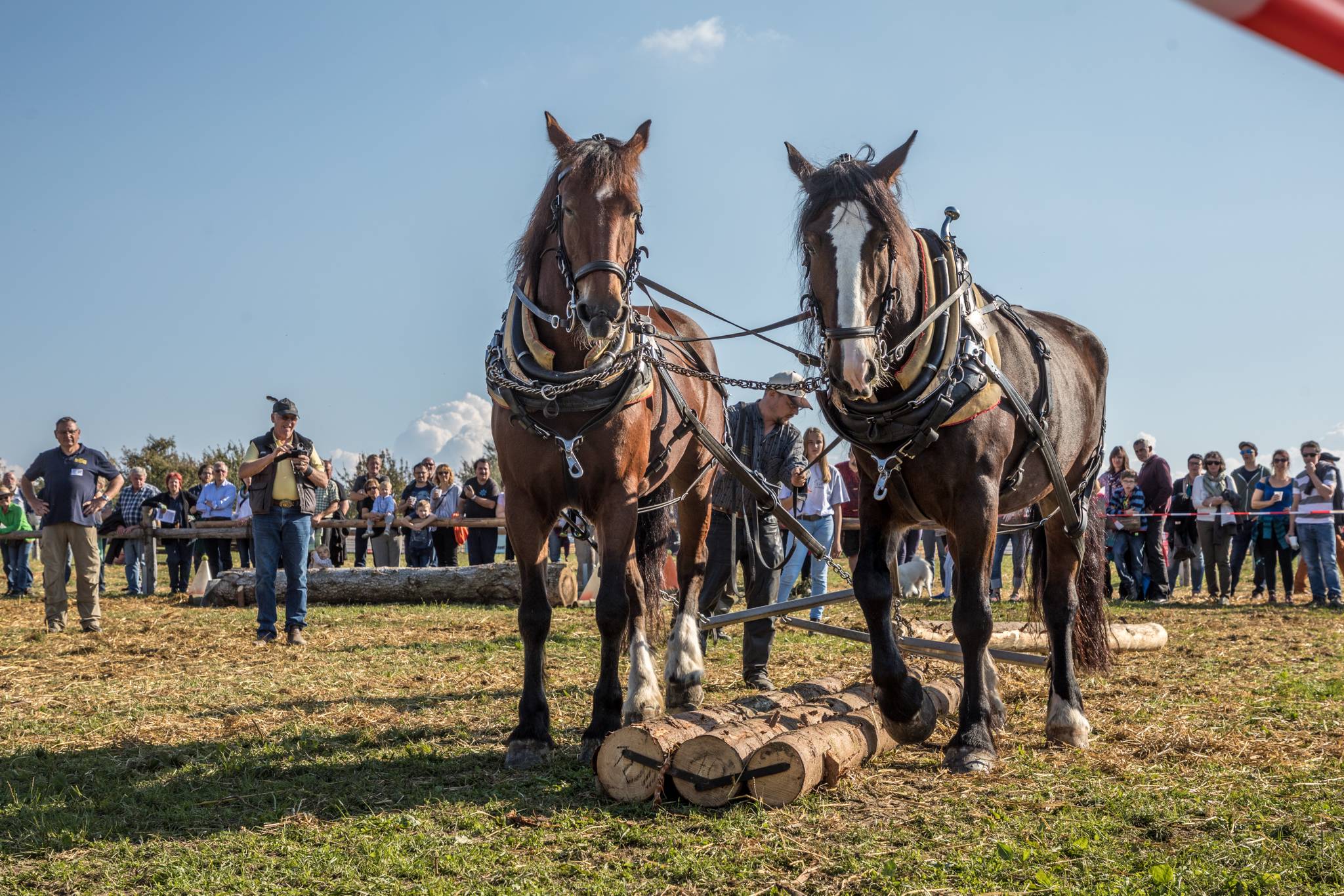 Impressionen Holzrueckewettkampf auf dem Horben bei Beinwil/Freiamt. Der Wettkampf ist der eigentliche Holzruecke-Arbeit im Wald nachempfungen. Neben Freibergern und Warmbluetern nehmen auch Ponys und einige Kaltblutpferde teil.