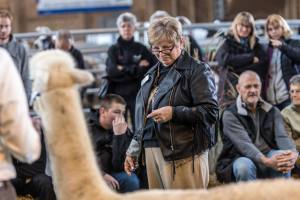 Elitezucht-Schau mit linear beschriebenen Alpakas und Lamas in der Markthalle Langnau im Emmental. Showrichterin Mary Jo Miller, Bardstown, Kentucky USA. Veranstalter Verein Neuweltkameliden Schweiz NWKS.