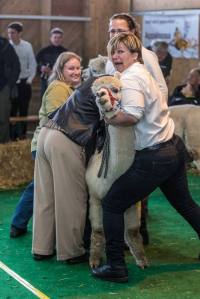 Elitezucht-Schau mit linear beschriebenen Alpakas und Lamas in der Markthalle Langnau im Emmental. Showrichterin Mary Jo Miller, Bardstown, Kentucky USA. Veranstalter Verein Neuweltkameliden Schweiz NWKS.