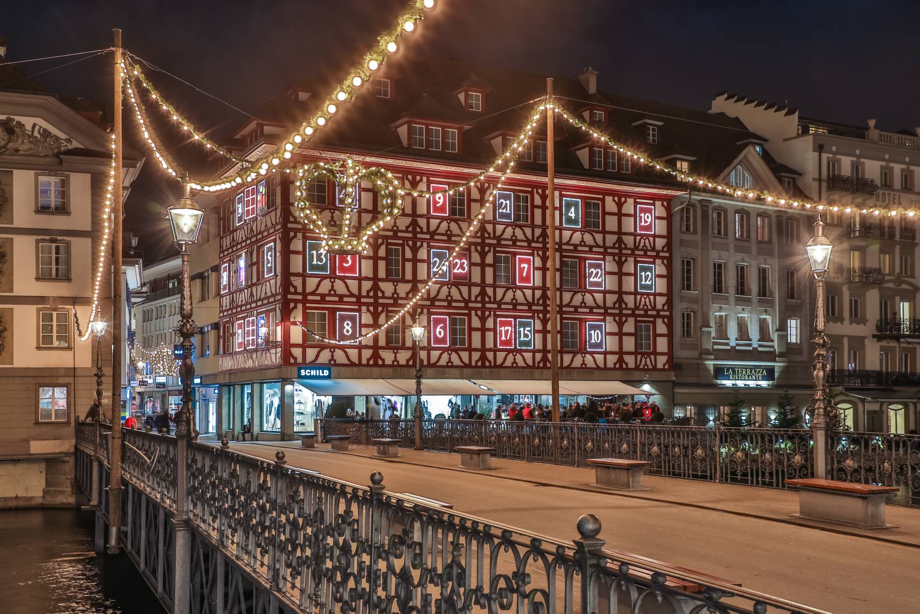 Weihnachtsbeleuchtung Reussbrücke mit "Spengler-Adventskalender"