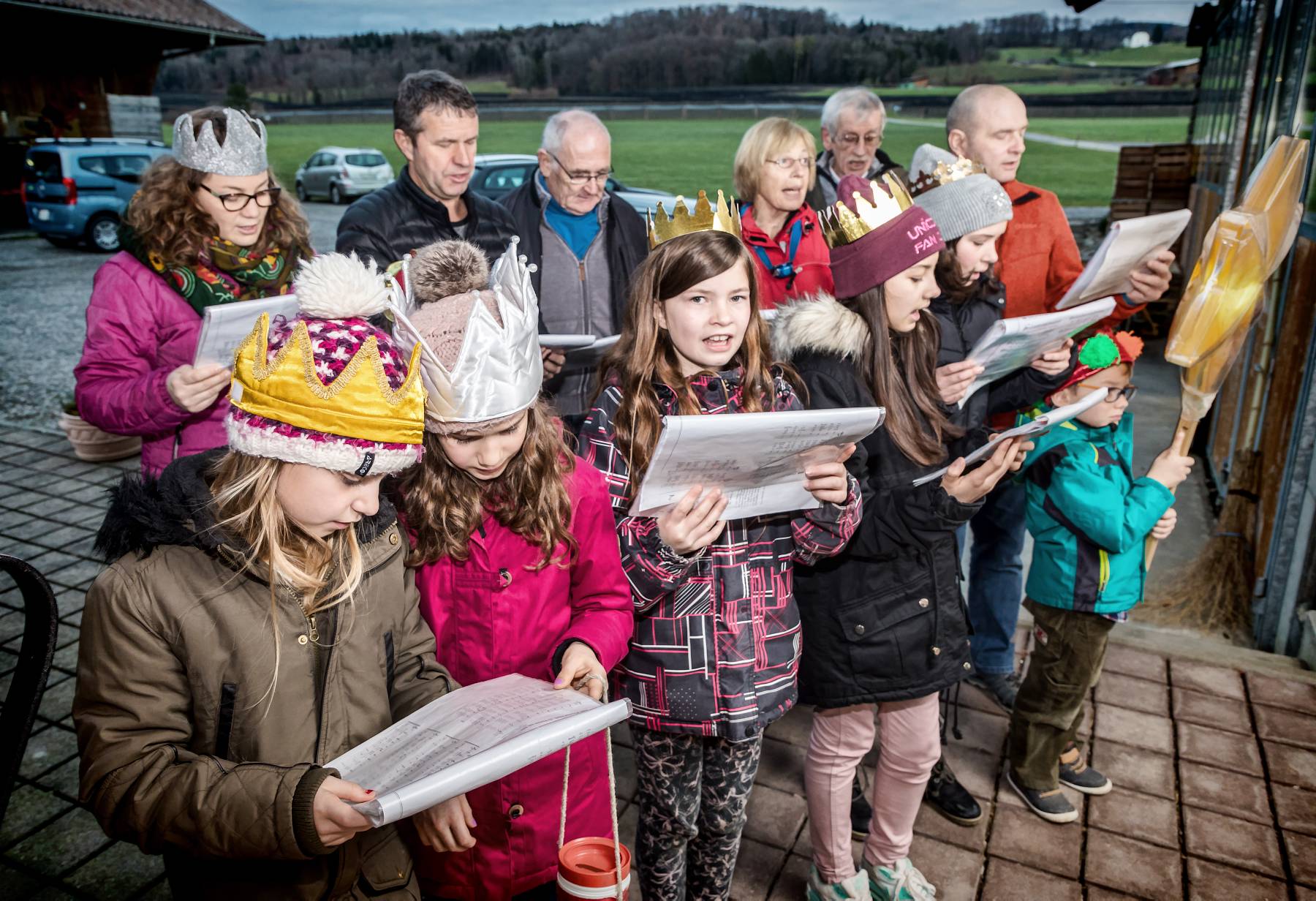 Gemeinsames Singen vor der Haustär. Immer mit dabei: der Stern und die Spendenbüchse.